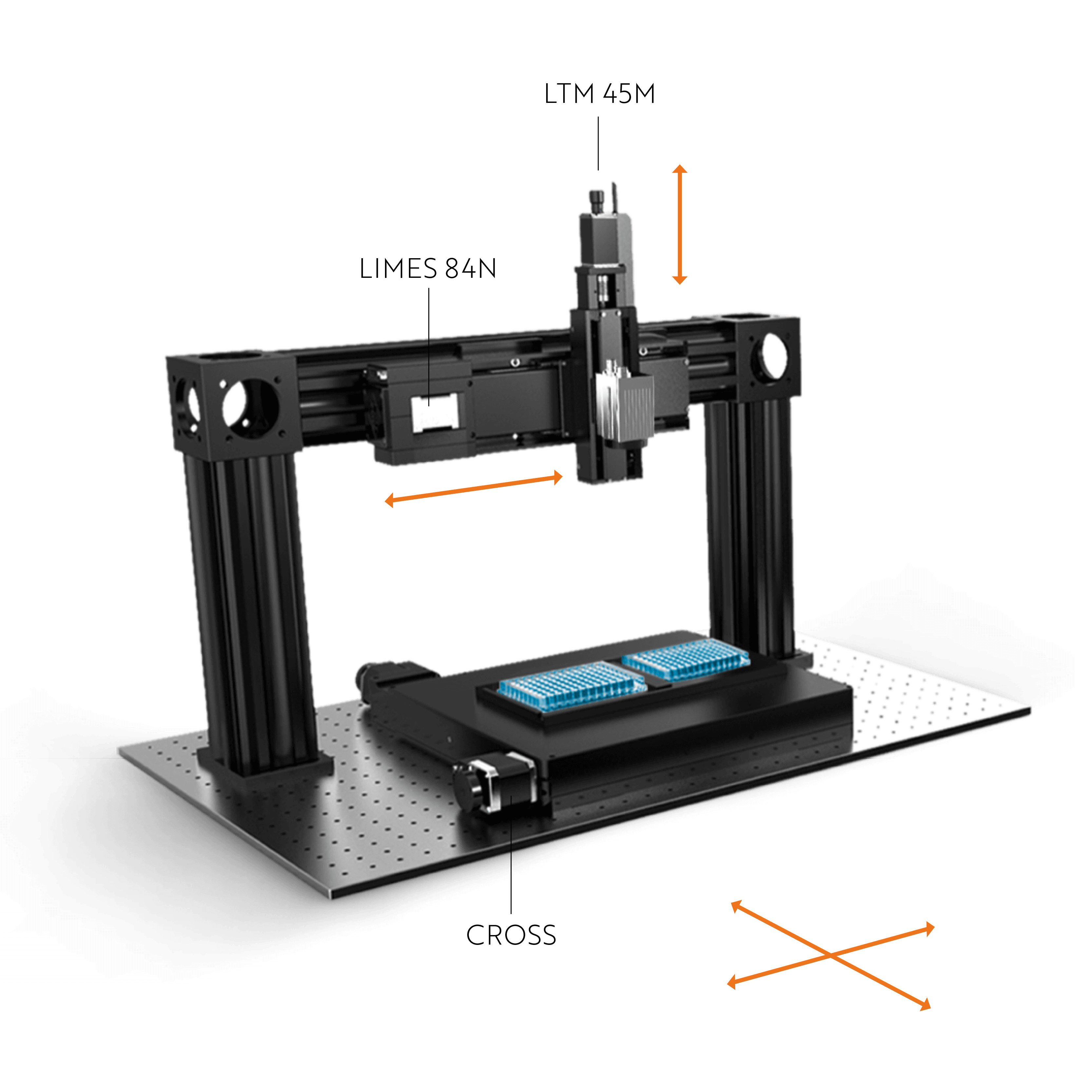 Im zweiten Beispiel (Abb. 3) wird ein Portal über dem Kreuztisch aufgebaut, welches zwei Lineartische trägt. Mit Hilfe des vertikal montierten Präzisions-Lineartischs LTM 45M können ebenfalls unterschiedliche Arbeitsabstände zur darauf montierten Kamera eingestellt werden. Dank des horizontal angebrachten Lineartisches kann auf dem einen Probenteller vermessen werden während zeitgleich auf der anderen Seite ein neuer Teller eingelegt wird. In unserem Beispiel ist der Hochpräzisions-Lineartisch LIMES 84N eingesetzt. Bei einer Synchronisation mit dem Kreuztisch kann die Prozesszeit zusätzlich reduziert werden.