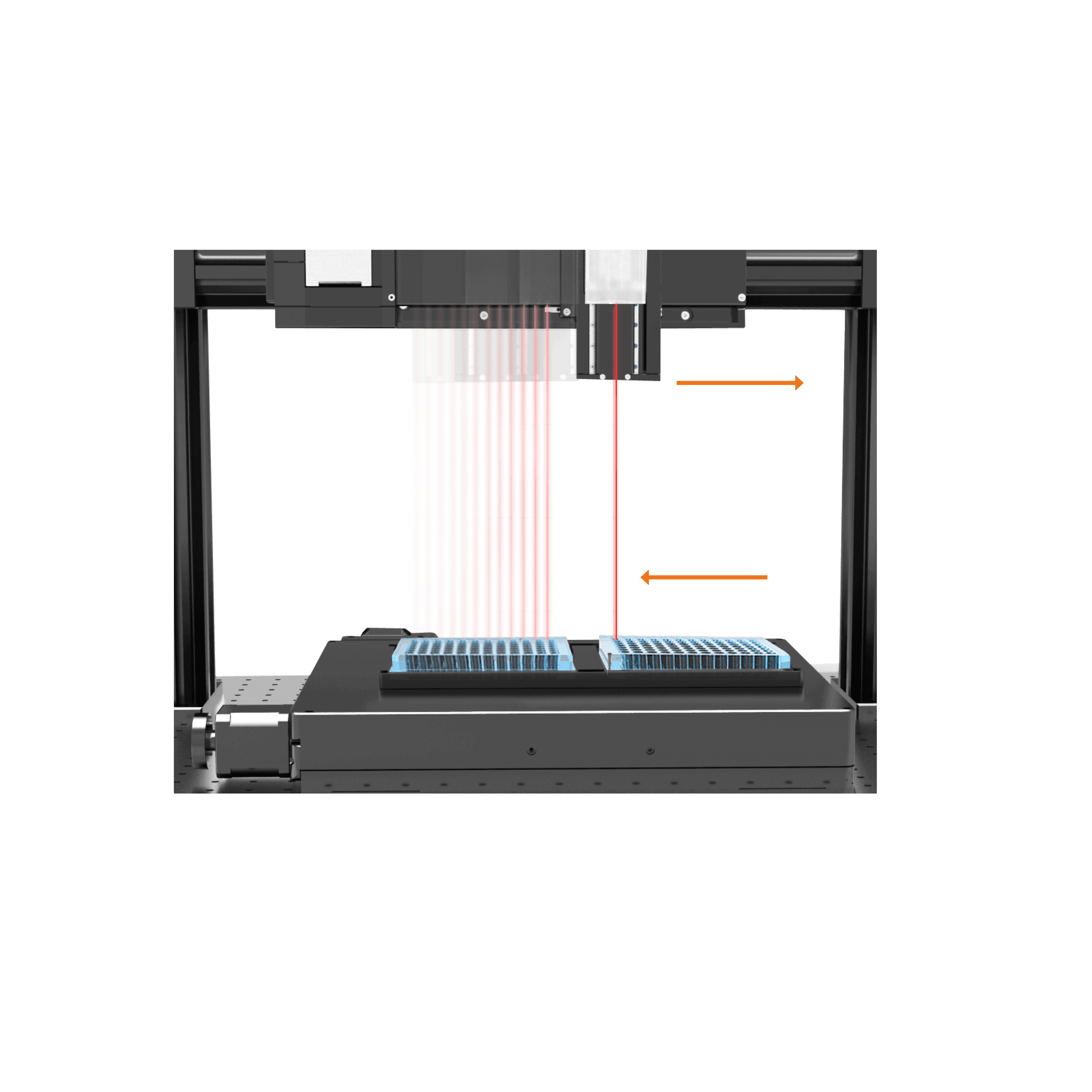 In unserem Beispiel aus der Messtechnik und Analytik sollen hunderte Proben so schnell wie möglich analysiert werden (Abb. 1). Bei dieser Anwendung ist nicht die laterale Verfahrgeschwindigkeit sondern die Prozesszeit der Hauptkostenpunkt. Durch die Summe der vertikalen Toleranzen aller Komponenten bedarf es einer individuellen Nachfokussierung der Kamera.