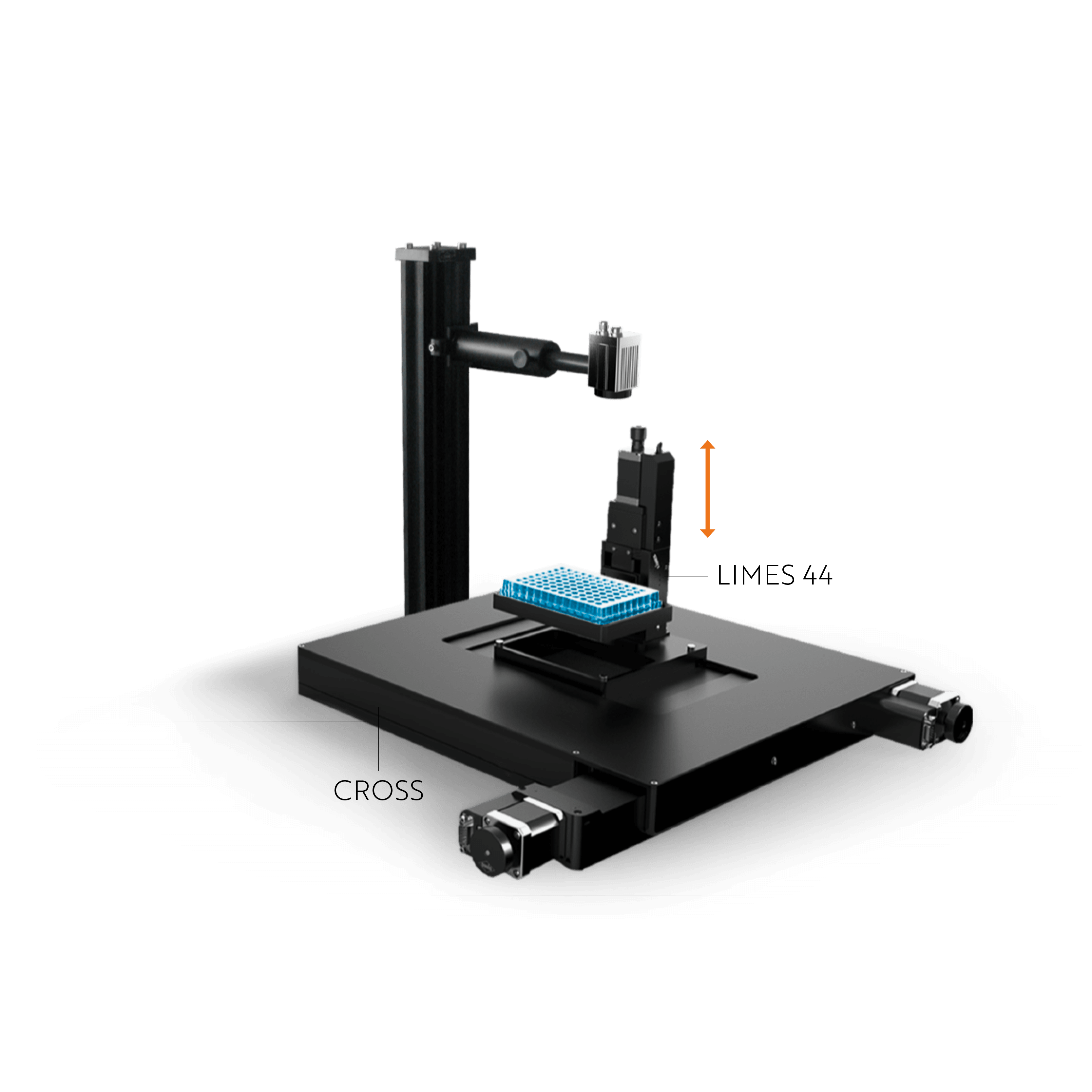 Im ersten Beispiel (Abb. 2) wird ein Lineartisch senkrecht auf den Kreuztisch montiert. Unabhängig von unserem System wird eine Kamera oberhalb des Lineartisches statisch angebracht. Mit Hilfe des Hochpräzisions-Lineartisches LIMES 44 wird der Probenhalter entlang der Z-Achse positioniert, wodurch unterschiedliche Arbeitsabstände zwischen Kamera und Proben realisiert werden können.
